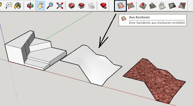 Hm, was genau möchtest du? "Gebüsch" kannst du dir aus dem Warehouse herunterladen und platzieren wohin du es haben möchtest. "Erde" - damit meinst du vielleicht einen Körper, der in das Dreieck zwischen Keller, Treppe und Oberkante Weg passen würde und den du mit "Erd-Textur" versiehst ? Du könntest das mit dem Sandkastenwerkzeug machen, da kannst du auch gekrümmte oder wellige schräge Oberflächen anlegen. Siehe einfaches Beispiel im Screenshot, erzeugt mit "Sandkiste>Konturen". Sage es mal etwas genauer, evtl. eine Beispiel-skp-Datei anfügen.