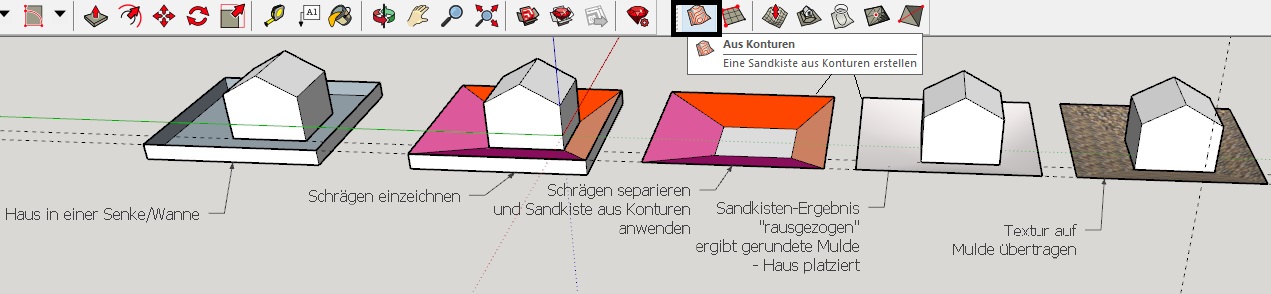 Um das (vorher gruppierte) Gebäude herum wurde eine Senke/Wanne gezeichnet. Von den Kanten der Wanne schräge abwärts laufende Linien zur Bodenplatte des Gebäudes gezeichnet - ergibt eine "kantige Mulde" als Schablone (hier farbig dargestellt). Diese Schablone herausgezogen (oder kopiert), markiert (blauen Rahmen drumherum) und Sandkisten-Werkzeug "aus Konturen" angewendet. Daraus entsteht eine innen leicht gerundet wirkende Mulde ohne störende Verbindungslinien - diese aus dem Rahmen herausziehen. Gerundete Mulde mit Textur belegen (Erde, Kies, Gestrüpp usw.) und gruppieren. Dann das Haus in die Mulde senken mit Hilfe von senkrechten/waagerechten gestrichelten Hilfslinien. Das kann man natürlich beliebig variieren. Man kann so auch einfache Landschaften, Gärten, Gelände mit Gräben, Schluchten und Hügeln darstellen.