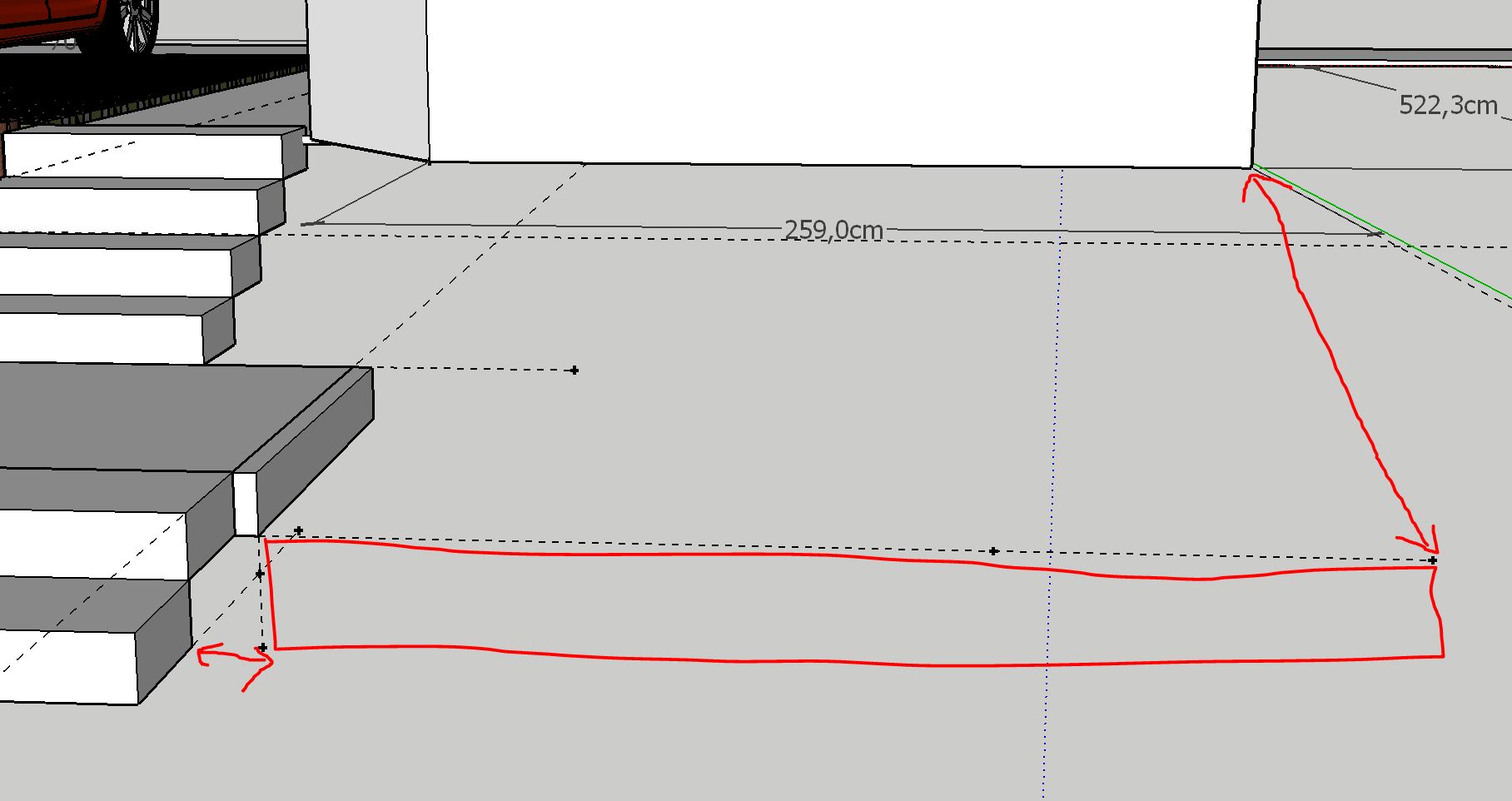 Ich habe eine Hilfslinie von der treppe bündig zur roten Achse gezogen. Und der Garagenecke eine Linie bündig zur blauen Achse herunter. Nun müsste ich eine Linie zwischen den beiden Hilfslinien ziehen um die Tiefe zu ermitteln, inwieweit ich gehen muss.