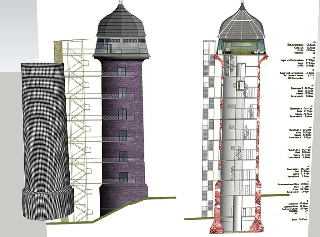 ich musste aus den verschiedensten Gründen das Projekt an die Seite stellen. Jetzt habe ich es aber wieder hervorgeholt und demnächst sollen die Turmteile auf den Drucker. Auch habe ich das Vorgehen nochmal geändert und bin jetzt nach der von Peter skizierten Methode vorgegangen. Will sagen, eine Reihe Steine ganz unten gebaut, eine Kopie eine Reihe nach oben kopiert und um einen halben Stein verdreht. Anschließend Volumenkörper gebildet und diesen in der benötigten Anzahl nach oben kopiert. Letztlich Volumenkörper zu einem verschmolzen. Anschließend dann den Turm mit Fredo Scale verzehrt. Das ganze sieht dann so aus. Allerdings lässt sich, so wie Peter bereits geschrieben hat, Zitat:Zur Info: Zuerst hatte ich gleich den Turm geschlossen und dann erst die Kegelverzerrung durchgeführt. Da machte meine Rechnerleistung nicht mit!! der ganze Turm nicht in einem Durchgang skalieren. Da haben auch meine recht modernen Rechner von der Leistung her gestreikt. Das ist aber nicht schlimm, da ich den Turm wegen der späteren Druckerei (Druckhöhe !) sowieso in Teile zerlegen muss. Bei den einzelnen Teilen ging es dann ganz gut. Ein Problem habe ich jetzt noch beiden den obersten Ringen. Die sind ja gebogen. Wenn ich aber 6 Schichten (zweireihige) Ringe zu einem Volumekörper vereinige und anschließend am oberen Rand um den Faktor 1.24 skaliere zieht er einen nahezu 45° Winkel Der soll aber eigentlich viertelkreisartig gebogen sein (wie der Bogen links daneben). Selbst wenn ich die 6 Ringsegment einzelen oben und unten jeweils einzeln skaliere, sieht das nicht schön aus. Hat jemand eine bessere Idee ? Danke und Gruss Oliver PS: Ich hab die erforderlichen Daten mal angehängt. Aber wenn, bitte nicht nur machen sondern auch erklären wie ;-)