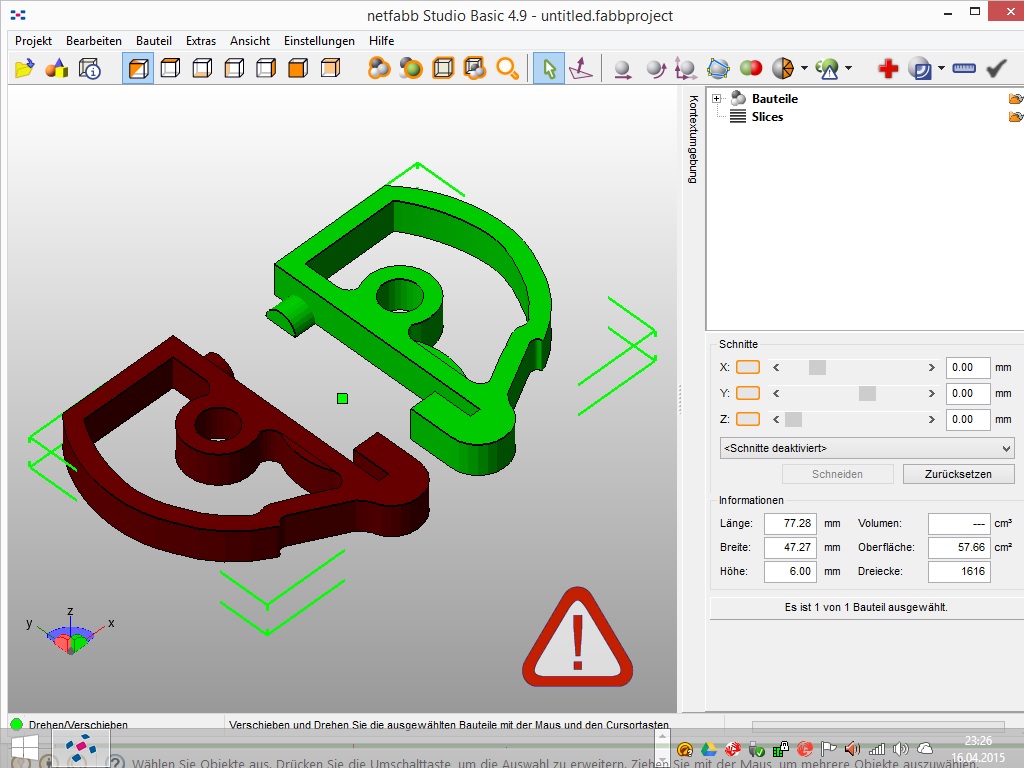 Was sich erst nach der Umwandlung in STL in NETFABB herausstellte, das waren die umgekehrten Flächen. In Netfabb werden solche Flächen rot dargestellt. Wenn ich das in SketchUp bemerkt hätte, dann wäre das Umkehren des gespiegelten Teiles natürlich eine Kleinigkeit gewesen.