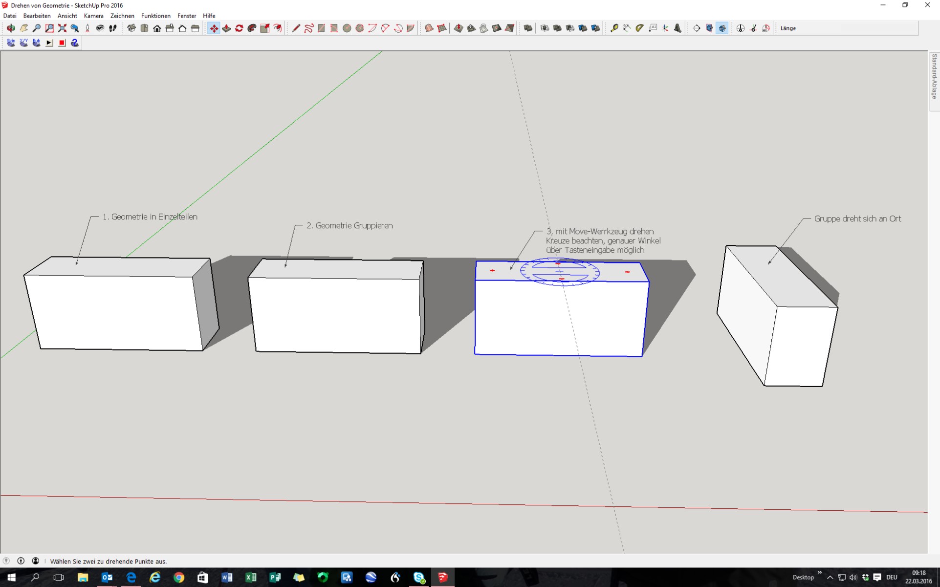 Hallo, ich möchte ein Objekt aus der "Waagerechten" in die "Senkrechte" stellen und benötige dafür einen rechten Winkel. Wo auch immer ich aber mit dem Winkelwerkzeug anfasse, es dreht sich in alle erdenklichen Richtungen, aber nicht dahin wo ich möchte. Ich weiß, das liegt nicht an SketchUp sondern an mir! Welche Stelle genau am Objekt muss ich "anfassen" bzw. welche einzelnen Schritte sind notwendig? Vielen Dank.