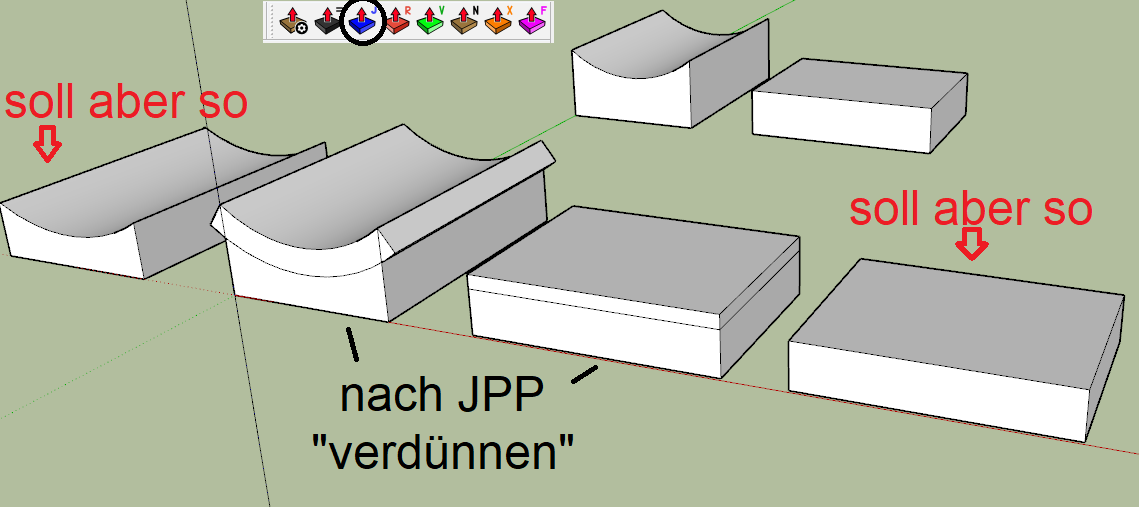 Plugin oder Werkzeug zum "Verdünnen" gekrümmter Flächen? - rosketch - 22.01.2019 Hallo, JointPushPull kann man zum Verdicken gekrümmter Flächen benutzen, aber geht das auch zum "Verdünnen" ? Es ist mir leider nicht gelungen. Oder ein anderes Werkzeug/Plugin? LG Rosketch [attachment=2540] RE: Plugin oder Werkzeug zum "Verdünnen" gekrümmter Flächen? - cotty - 23.01.2019 Ist denn oben eine Fläche? RE: Plugin oder Werkzeug zum "Verdünnen" gekrümmter Flächen? - rosketch - 23.01.2019 (23.01.2019 - 06:54)cotty schrieb: Ist denn oben eine Fläche? Ja gewiss, die Fläche lässt sich auch absenken, aber die Kanten bleiben "oben" und es entsteht eine Senke. Hat jemand mal "verdünnen" versucht, mit JointPushPull oder mit was anderem? LG Rosketch RE: Plugin oder Werkzeug zum "Verdünnen" gekrümmter Flächen? - Peter C - 23.01.2019 Hallo Rosketch, ich hatte da jetzt auch meinen Ergeiz und wollte Dir in einem selbst gemachten Video zeigen, dass auch das "Verdünnen" geht. Aber leider..., auch bei mir zeigt sich das gleiche Ergebnis mit der entstehende "Wanne". Ich habe alles durchprobiert: