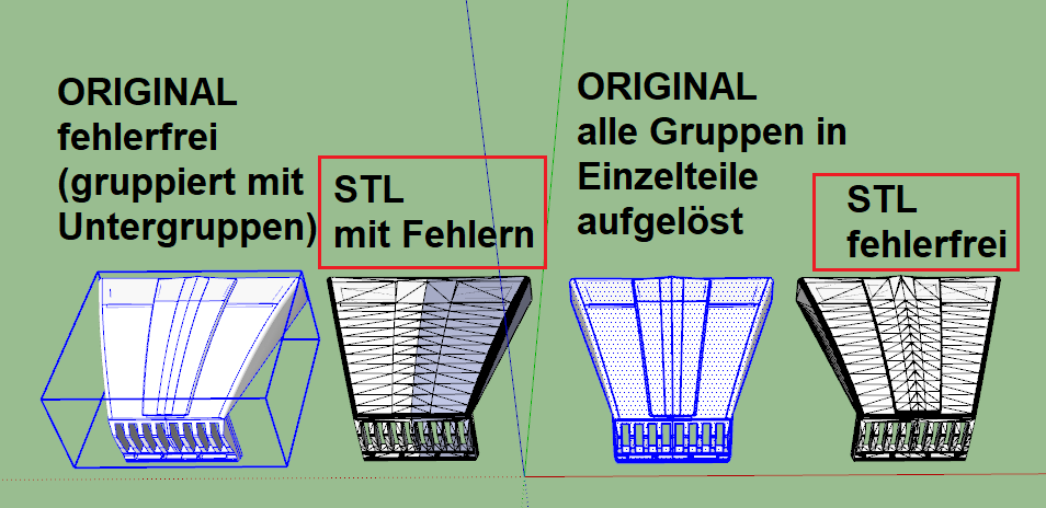RE: SU Pro 2020 vs SU Make 2017 - STL-Darstellung - rosketch - 05.05.2020 Falls mich jemand bei der Ursachensuche für die STL-Fehler unterstützt: Ich habe die runden Elemente aus der SKP-Datei von Posting #6 noch einmal genauer "unter die Lupe genommen". Dabei habe ich festgestellt: - solange die Originale (die in der STL doppelt vorkommen) "einzeln gruppiert" sind und sich dann als Untergruppen in der Hauptgruppe befinden, tritt der STL-Fehler auf - wenn die Originale "ungruppiert" sind (in Einzelteile) , sind auch die erzeugten STLs fehlerfrei - werden die "ungruppierten" Originale in einer Gesamtgruppe zusammengefasst, also ohne Untergruppen, sind auch die STLs fehlerfrei Das habe ich mit verschiedenen Zwischenstufen im Screenshot dokumentiert. Vielleicht sollte das Thema an Trimble gemeldet werden? Ich weiß zwar jetzt, dass ich durch vorheriges "in Einzelteile zerlegen" die STL-Probleme vermeiden kann, aber es ist natürlich sehr lästig. Es tritt ja auch nicht immer auf, sondern nur in ungünstigen Konstellationen, die aber bei mir leider vorkommen. Die meisten User oder Forenmitglieder betrifft das kaum und interessiert es deshalb wahrscheinlich gar nicht. In SU Make 2017 habe ich das Problem nicht. Noch gravierender ist das Problem, wenn man Modellbauteile, wie diese aus mehreren Gruppen bestehende Kühlerhaube mit Kühler, in alle "Einzelteile zerlegen müsste" um fehlerfrei STLs zu bekommen. Das geht eigentlich gar nicht, denn dann "fliessen die Konturen des Originals ineinander" , was man aber gerade vermeiden will. Siehe Screenshot. LG Rolf Edit: So, ich habe mein Speicherkontingent gesäubert und nochmal eine SKP-Testdatei als ZIP (Kühlerhaube siehe Screenshot) angefügt: