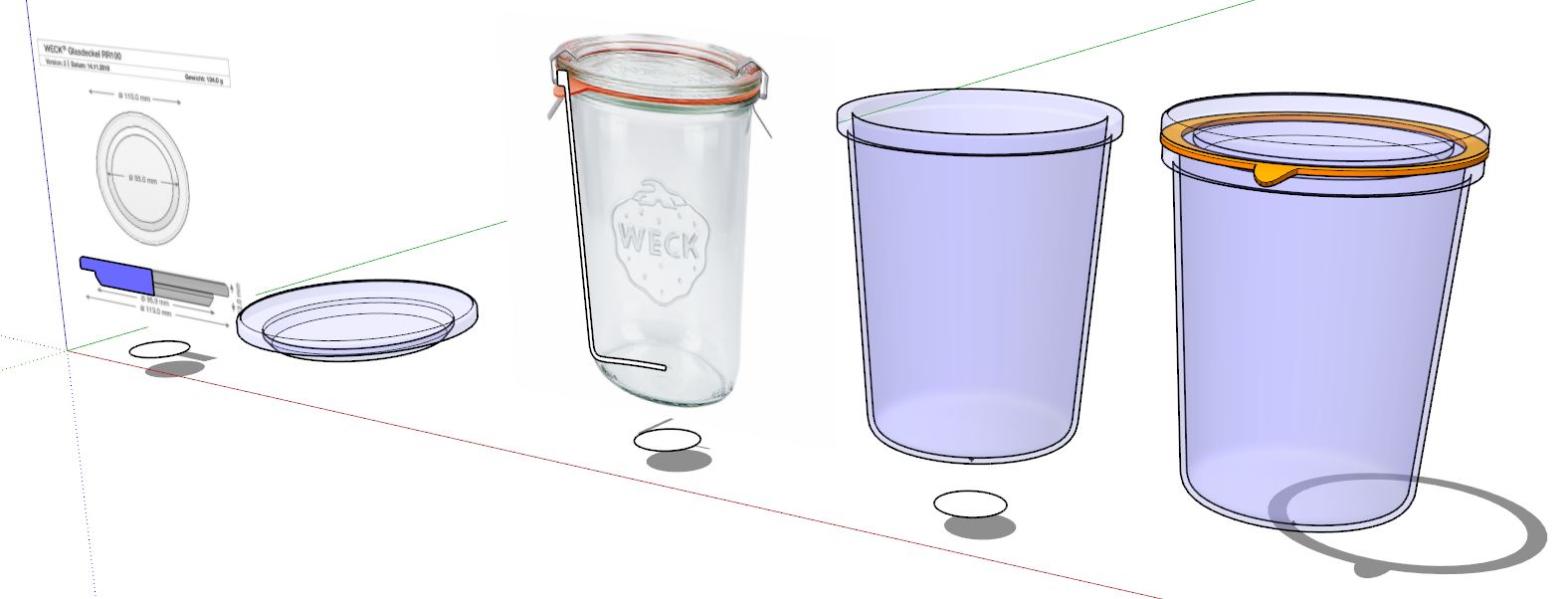 Weck-Sturzglas - finewoodworking - 04.01.2022 Moin. Ich zeichne gerade für eine Freundin ein einfaches Wandregal für Einmachgläser der Traditionsmarke Weck. Konkret: Sturzgläser # Durchmesser oben am Deckel 110mm Durchmesser unten 81mm 850ml Höhe mit Deckel 152mm https://www.shop-weck.de/epages/64573964.sf/de_DE/?ObjectPath=/Shops/64573964/Products/1117 580ml Höhe mit Deckel 110mm https://www.shop-weck.de/epages/64573964.sf/de_DE/?ObjectPath=/Shops/64573964/Products/1116 370ml Höhe mit Deckel 73mm https://www.shop-weck.de/epages/64573964.sf/de_DE/?ObjectPath=/Shops/64573964/Products/1115 Ich habe schon herumgesucht, aber leider keine fertiges Sketchup-Weckglas gefunden. Falls jemand sowas schonmal zufällig modelliert hat: ich würde mich freuen, wenn ich sie verwenden dürfte : ) RE: Weck-Sturzglas - Peter C - 04.01.2022 Hallo, mit diesem Link findest Du die genauen Abmessungen eines Deiner Gläser. Ich bin der Meinung, dass es wirklich kein großes Problem ist, ein solches Glas zu modellieren. Der zeitliche Aufwand hält sich in Grenzen. Beginne mit der Häfte des Profils des Glases. Danach mit einem Kreis und Folge Mir das Glas fertig modellieren. Fertig! Der Deckel ist ja sogar sehr ordentlich vermaßt. LG Peter RE: Weck-Sturzglas - cotty - 04.01.2022 Hier Peters Vorschlag in Bild und Modell... |