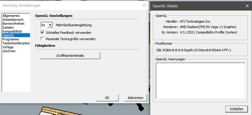 keine geraden Kanten - juleim - 29.01.2016 [attachment=983] Hallo, habe das Problem dass (sketchUp make) die Kanten zerhackt sind. Also die Linien sind nicht schön in einem Strich, je nach Perspektive mehr oder weniger. Liegt das an meinem Mac? Danke schon mal für alle infos... Grüsse J. RE: keine geraden kanten - Techie - 29.01.2016 die verwendete Kantenglättung kann unter "SketchUp > Preferences > OpenGL" konfiguriert werden: ![]() Hier sollte eine 4-fache Kantenglättung eingestellt werden, eventuell angezeigte höhere Werte (abhängig von Grafikkarte bzw. Treiber) bringen nur noch wenig und verlangsamen die Bildschirm-Ausgabe. SketchUp beenden und neu starten. Norbert RE: keine geraden kanten - juleim - 29.01.2016 vielen dank, werde ich gleich versuchen.... freundliche grüsse Jürg RE: keine geraden kanten - juleim - 29.01.2016 habe nur diese Einstellungen: [attachment=988] RE: keine geraden kanten - Techie - 30.01.2016 vermutlich ein iMac ohne dedizierter, d.h. eigenständiger Grafikkarte sondern mit einer integrierten Grafiklösung (intel HD) ohne den für 3D-Modellierer notwendigen vollständigen OpenGL-Support (System-Voraussetzung). Kannst nochmal das System-Update des Mac OS laufen lassen (ohne viel Hoffnung) und testweise die Hardwarebeschleunigung deaktivieren. Norbert RE: keine geraden kanten - juleim - 30.01.2016 super ...da habe ich doch einen Anhaltspunkt! vielen dank für deine info Grüsse Jürg RE: keine geraden kanten - Mr.Claude - 26.03.2019 Hallo, Ich habe das gleiche Problem, die Auflösung ist grottenschlecht! Die Kantenglättung verändert sich bei 2017Make und 2019 Pro nicht (Mehrfachkantenglättung 4x und 8x) An was kann das liegen, ich bin so ziemlich alle Einstellungen durchgegangen Mein PC sowie GraKa sind Neu/Aktuell MoBo: MSI MORTAR B450 CPU: AMD RYZEN 5 2.400G (Radeon Vega 11) RAM: 16GB Monitor 43" Samsung LC43J890 RE: keine geraden kanten - Techie - 26.03.2019 - aktuelle Treiber-Version 19.3.3 (20.03.2019) installiert? - läuft SketchUp auf der Vega: "Fenster > Voreinstellenungen > OpenGL > Grafikkartendetails" - welche Auflösung konfiguriert? - welche Farbtiefe konfiguriert? - mehrere Bildschirme? Norbert RE: keine geraden kanten - Mr.Claude - 26.03.2019 Hallo Norbert, Ich hänge dir einfach mal alle Infos zu deinen Fragen hier an ;-) den neuen Treiber versuche ich gerade zu laden aber auf den Seiten scheint was nicht zu funktionieren denn er ist immer noch am "Laden" Ich hatte irgendwo in der Sketchup Info gelesen daß 24bit Notwendig wären aber diese scheint meine GraKa nicht zu unterstützen. RE: keine geraden kanten - Techie - 26.03.2019 der Treiber-Download ist 327 MB... dauert etwas läuft aber hier problemlos. Die 8 Bit Farbtiefe beziehen sich auf den Bildschirm, die Windows Desktop-Farbtiefe ist lt. den Grafikkartendetails korrekt bei "Depth: 24" (2^24 = 16.777.216 Farben) konfiguriert, was im übrigen jede aktuelle GraKa unterstützt. Mach auch mal testweise das "Schnelle Feedback" aus (SU beenden/starten), da gibt's unter Windows 10 in Verbindung mit bestimmten GraKas/Treibern (speziell intel HD Serie) immer wieder unsystematische Probleme mit der OpenGL-basierten Bildschirmausgabe. Norbert |